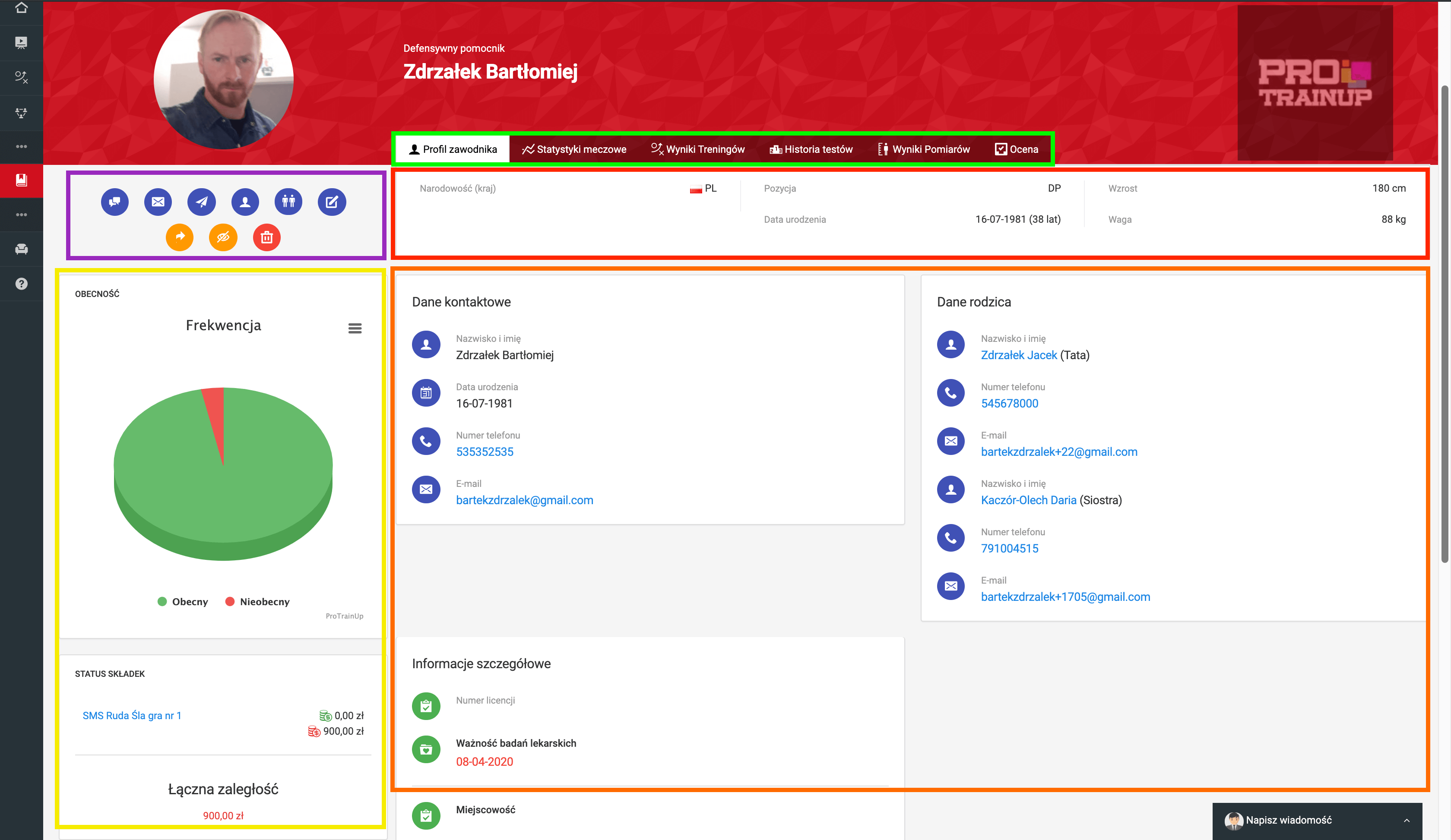 Το προφίλ ενός παίκτη αποτελείται από διάφορες ενότητες, οι οποίες είναι χρωματισμένες στην παραπάνω εικόνα. Το πράσινο είναι μια λίστα με σελιδοδείκτες, στους οποίους μπορείτε να κάνετε κλικ για να μεταβείτε στην αντίστοιχη ενότητα του προφίλ του παίκτη. Το βιολετί είναι το μενού λειτουργιών, το οποίο σας επιτρέπει να εκτελείτε ενέργειες όπως επεξεργασία προφίλ, διαγραφή προφίλ, απόκρυψη του παίκτη, αποστολή προσωπικού μηνύματος ή e-mail. Το κόκκινο είναι η ενότητα που εμφανίζει τα μετρικά και ανθρωπομετρικά δεδομένα του παίκτη. Το κίτρινο είναι το τμήμα με πληροφορίες σχετικά με τη συμμετοχή και τις σημειώσεις συνεισφοράς. Το πορτοκαλί είναι το τμήμα που περιέχει προσωπικά δεδομένα του παίκτη και των γονέων του.
