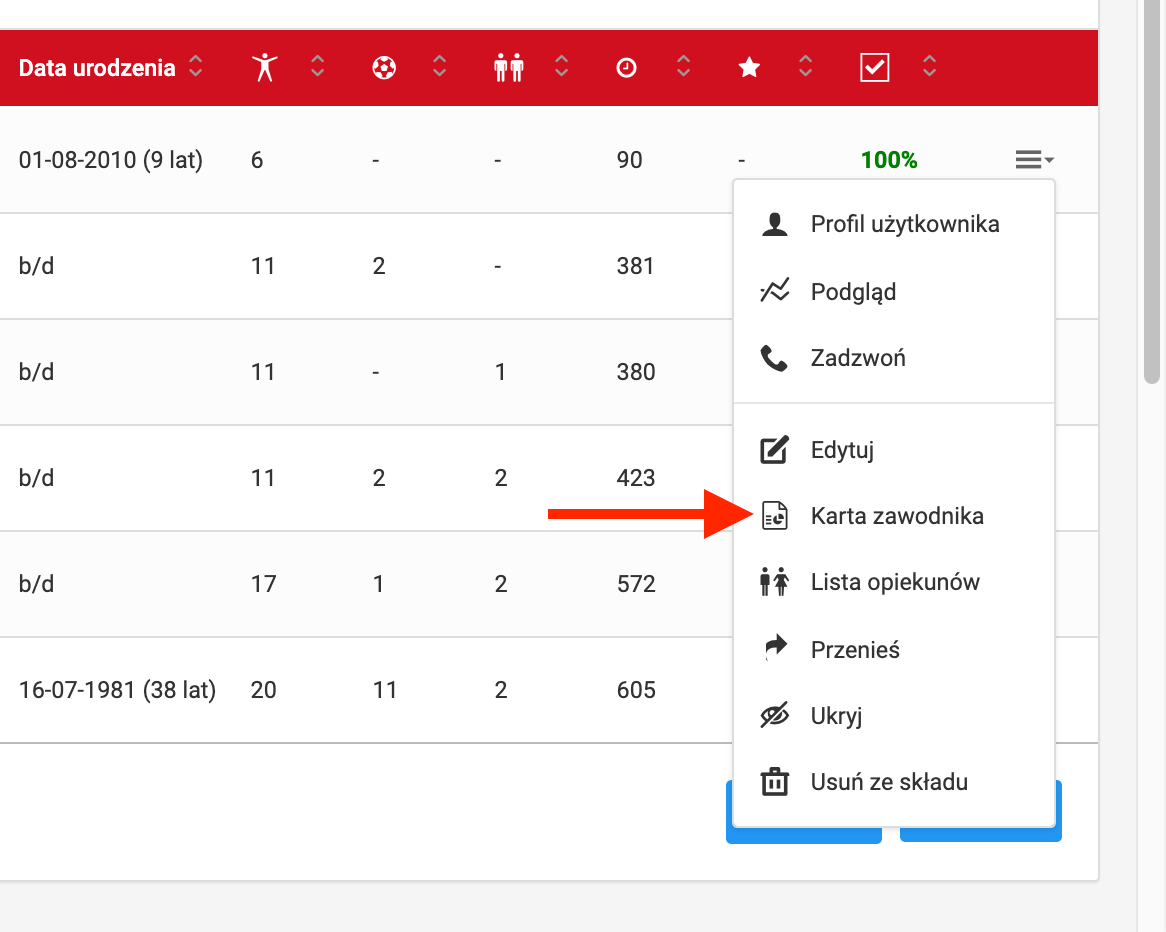 Κάθε παίκτης στο σύστημα έχει δημιουργήσει αυτόματα προφίλ και κάρτα παίκτη. Και οι δύο αυτές καρτέλες συλλέγουν τα πιο σημαντικά δεδομένα του για την επιλεγμένη σεζόν. Για να μεταβείτε στο προφίλ του παίκτη, πρέπει να μπείτε στη λίστα παίκτη και να κάνετε κλικ στο όνομα του.
