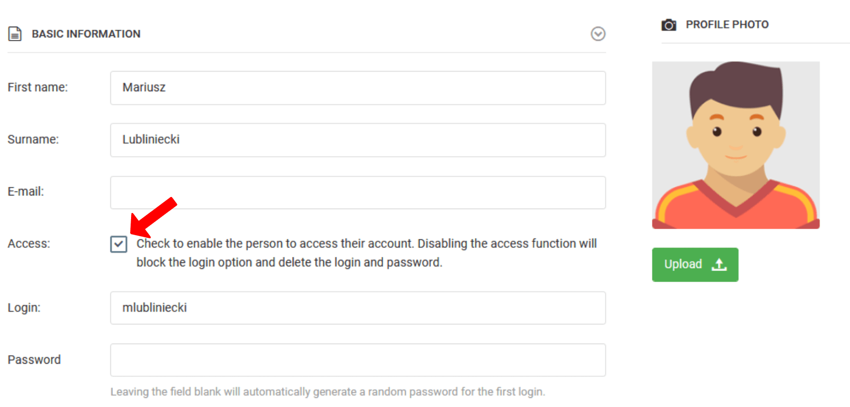και θα μπορείτε επίσης να αλλάξετε δεδομένα όπως όνομα, επώνυμο ή e-mail. Από εδώ μπορείτε να δώσετε στον παίκτη πρόσβαση στο σύστημα. Απλώς επιλέξτε το γκρι πλαίσιο ελέγχου και το σύστημα θα δημιουργήσει μια σύνδεση και έναν κωδικό πρόσβασης για τον παίκτη. Το προφίλ μπορεί επίσης να επεξεργαστεί από τον γονέα του παίκτη.
