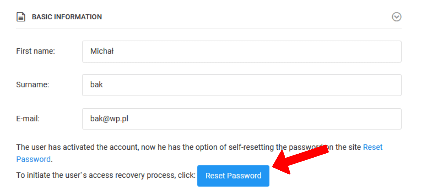 Για να ενεργοποιήσετε τη λειτουργία επαναφοράς κωδικού πρόσβασης από το παράθυρο επεξεργασίας προφίλ του παίκτη, πρέπει να κάνετε κλικ στο μπλε κουμπί "επαναφορά κωδικού πρόσβασης". Το μπλε κουμπί θα στείλει ένα e-mail στη διεύθυνση του παίκτη με οδηγίες και έναν σύνδεσμο για το παράθυρο επαναφοράς κωδικού πρόσβασης.