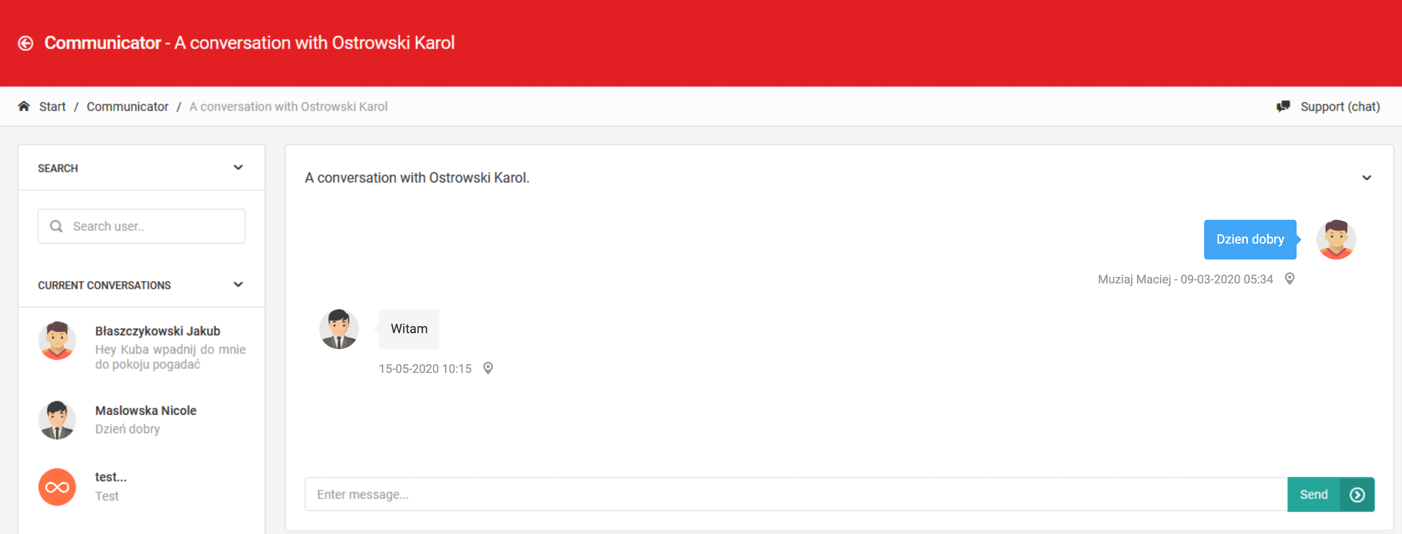 From the level of the mobile application as well as from the level of the web browser there is a messenger available which allows for communication between the system users. There are two modes of conversation available - private (1 to 1) and group conversation in which more users can take part.