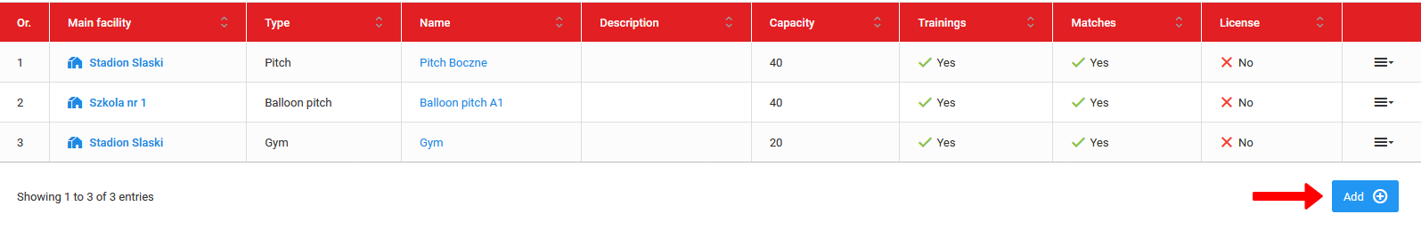 To add a sub facility to the parent facility, go to the list of sub facilities and click the blue "add" button. You can add as many sub facilities as you like in a given facility. Remember that it is from among the sub-objects that you will choose the location when adding a training session or a match.