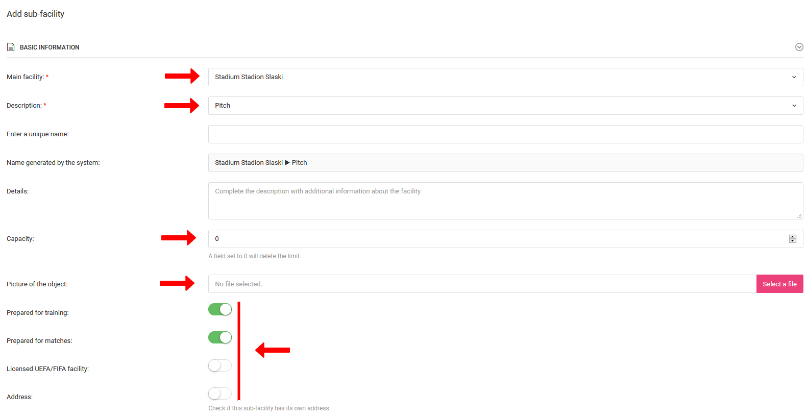 After clicking add, you will be taken to the add sub facility form, where you will have several important fields to fill in. The first element is to determine the parent facility and category of the sub facility. You can choose from the list: pitch, swimming pool, hall, locker-room or gym. In the next stages, complete the name and description of the sub facility, specify the maximum number of people, add a photo, and other parameters of the sub facility. If it has an individual address, you can also add it.