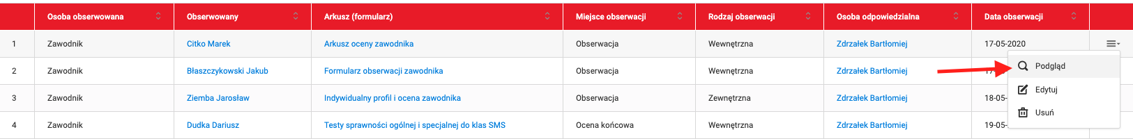 To enter the preview of an observation, select tabs from the left menu Club Evaluations and observations List of observations. Then find an observation and press the "preview" button from the menu in the last column. You can also edit the observation or delete it.