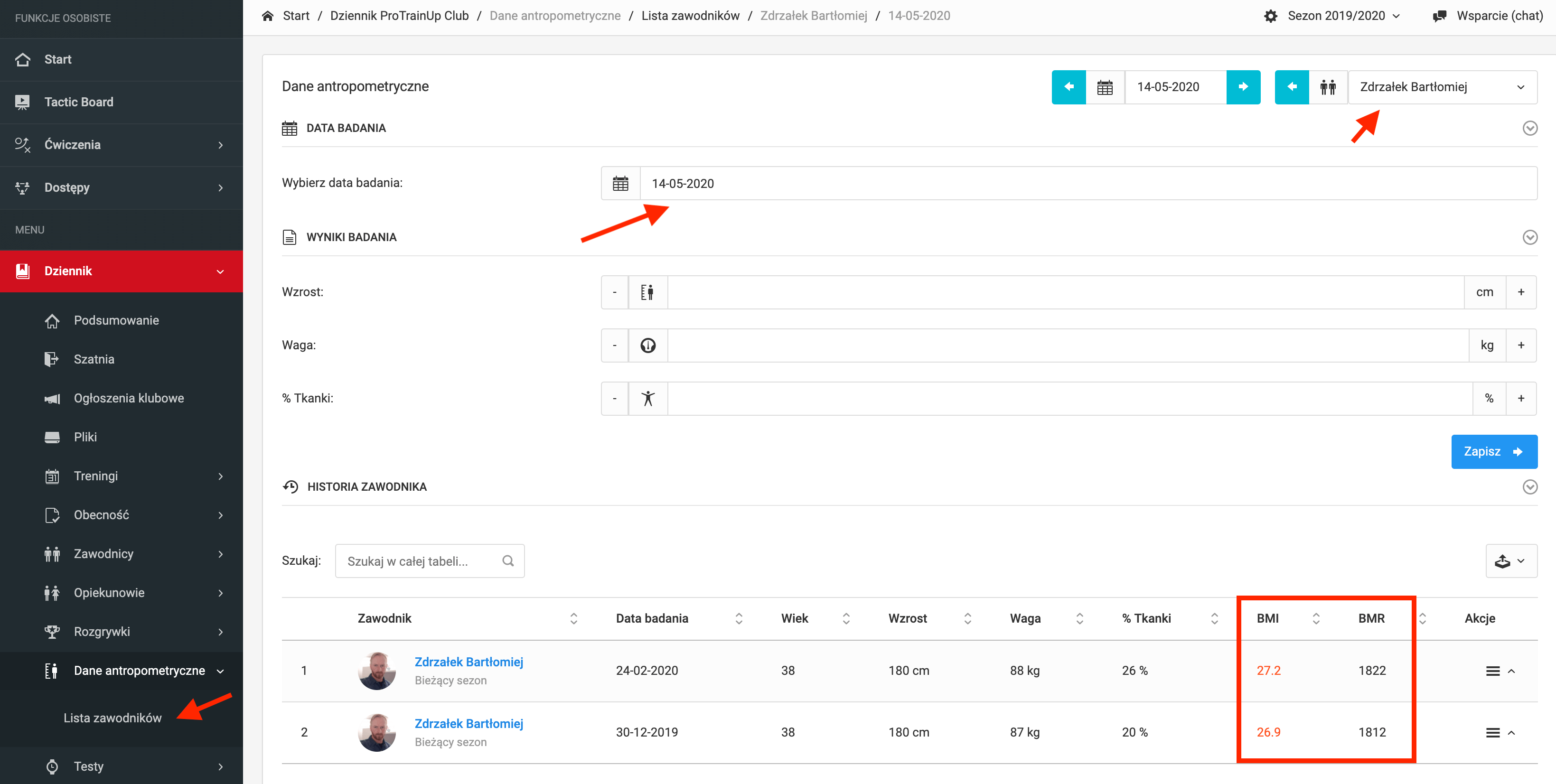 Aby wprowadzić dane antropometryczne wybierz z lewego menu opcję dziennik dane antropometryczne lista zawodników i tam przy danym zawodniku kliknij ikonkę "uzupełnij".
