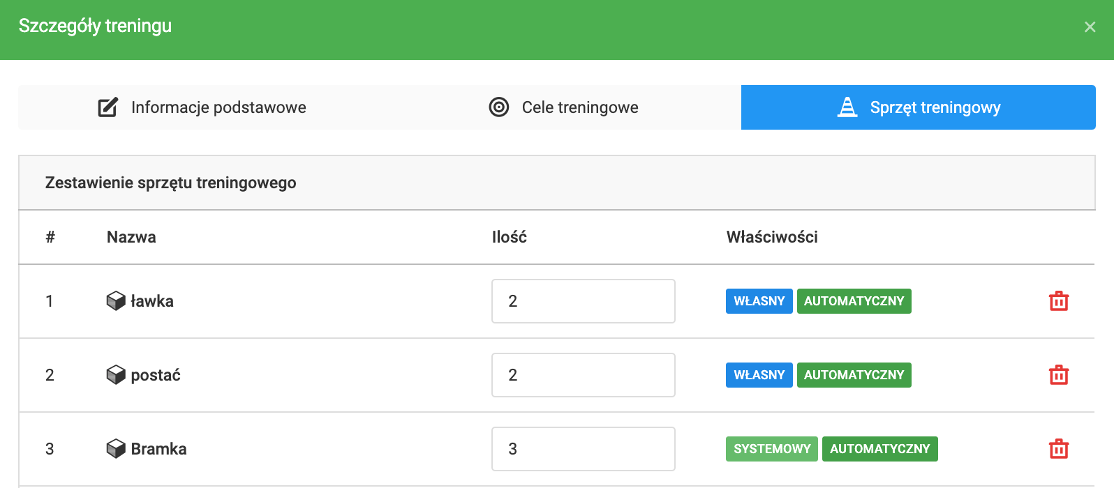 Następnym krokiem jest określenie celów treningowych. Są one podzielone na cztery typy: technika, motoryka, działania grupowe oraz mentalność. Ostatnim krokiem jest ustalenie potrzebnego sprzętu, domyślnie jest on generowany z dodanych do danego treningu ćwiczeń.