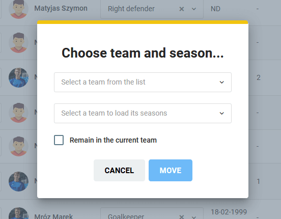 Система дает возможность копировать / перемещать игроков между командами в рамках одной субъекта. При копировании игрока у нас есть возможность скопировать или переместить игрока. Для этого выберите опцию «Переместить» из списка игроков в меню игрока.