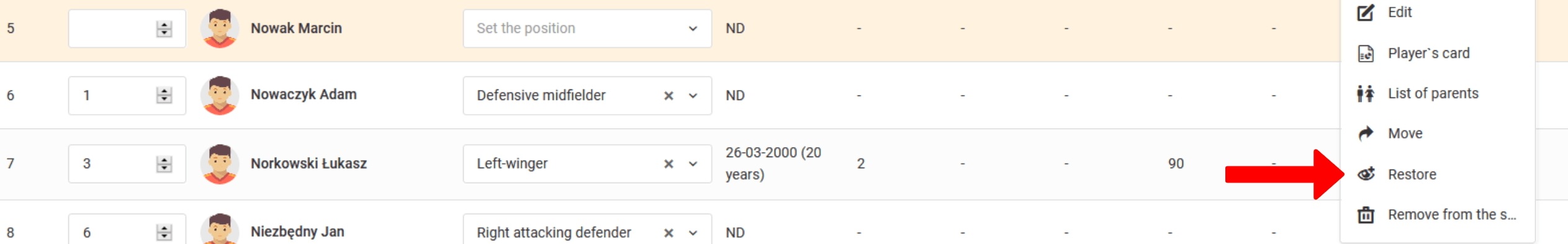 Функция скрытия используется, чтобы скрыть игрока в таких списках, как отряд, список посещаемости, отряд матча и т. Д. Скрытый игрок не исчезнет, ​​например, из списка вкладов, поскольку выплаченные им суммы формируют общий финансовый баланс команды. Естественно скрытый игрок специально отмечен в списке вкладов. Если мы имеем дело со случаем, что игрок перешел в другую команду (старший год) и теперь будет платить свои взносы в старшем году, он должен быть освобожден от младшей команды. Вы можете узнать, как это сделать, в главе о взносах. Помните, что вы можете восстановить скрытого игрока в любое время. Для этого установите флажок «показать скрытый» и нажмите «восстановить» в меню выбранного игрока.